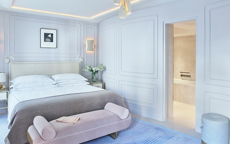 Calming, tonal palettes work especially well in a bedroom. “For the Goring Hotel, we used a lot of old golds and very pale greys, rather than being too fashionable or loud,” says Sage.